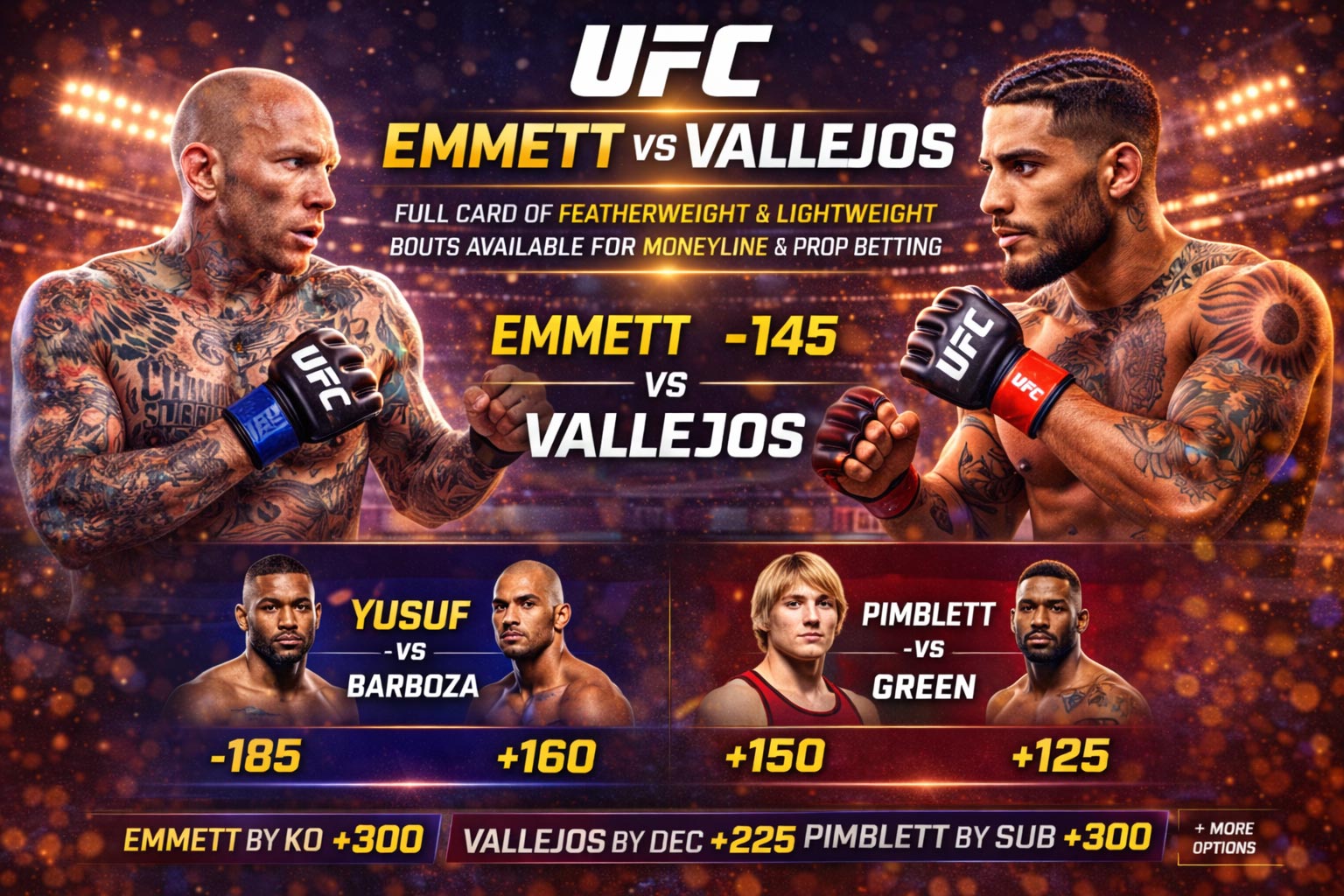 I’ve been tracking the Emmett vs Vallejos line movement since it dropped, and the market’s telling a story most casual bettors are completely missing. This UFC Fight Night card isn’t getting the primetime hype, which means sharp money has room to operate without getting crushed by public action. The featherweight and lightweight matchups here offer legitimate arbitrage opportunities if you know where to look. In my breakdown, I’m focusing on the props that scream positive expected value rather than chasing the obvious plays everyone and their uncle is hammering.