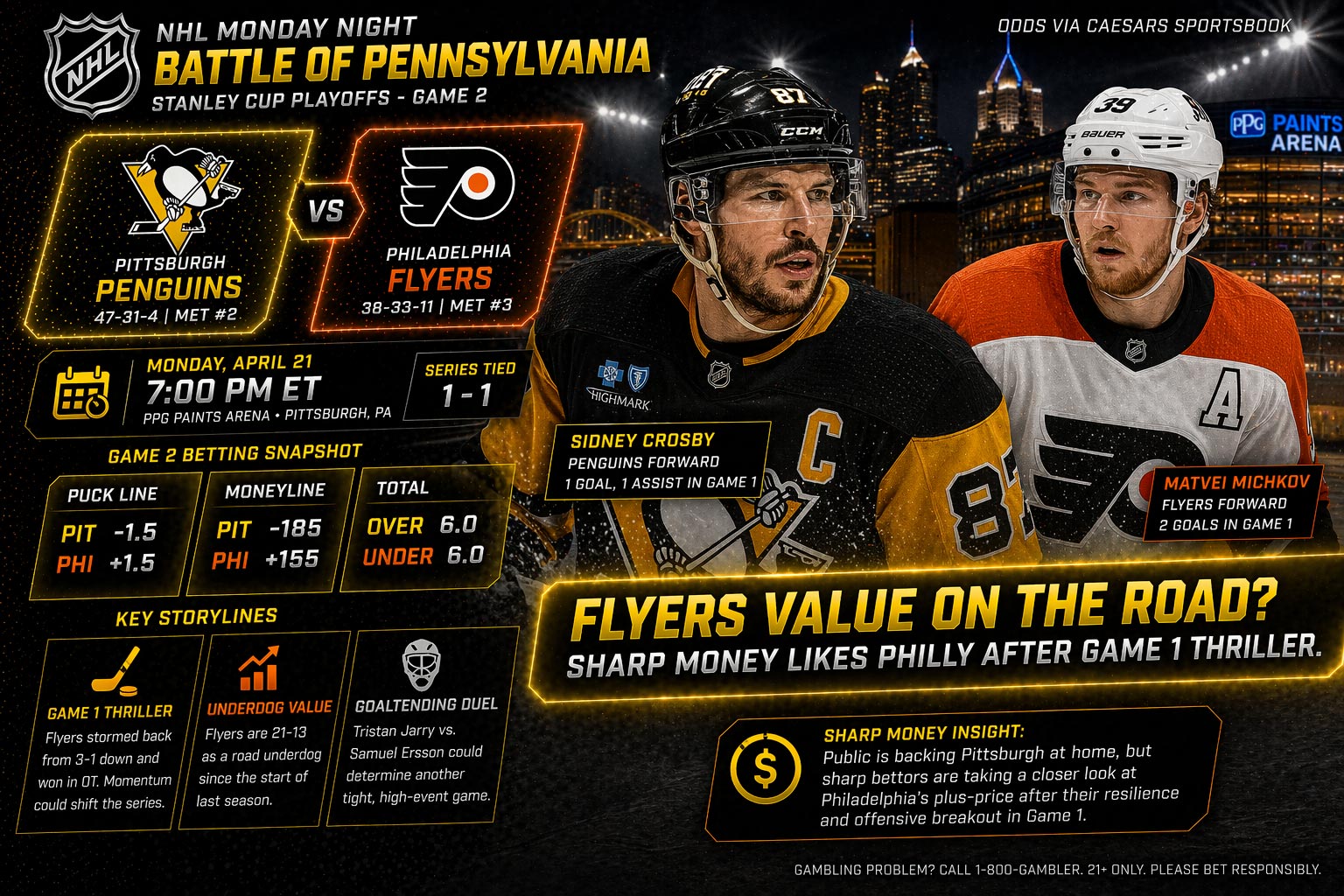 The Battle of Pennsylvania just delivered a six-goal overtime banger, and while the public’s still nursing their hangover from that Game 1 chaos, the sharps are already circling Game 2 like vultures at a buffet. Pittsburgh took the opener, but the market’s treating this Flyers squad like they just got swept in four – and that’s exactly the kind of inefficiency that makes my MBA professors weep tears of joy. When everyone’s zigging on recency bias, smart money zags on market correction.