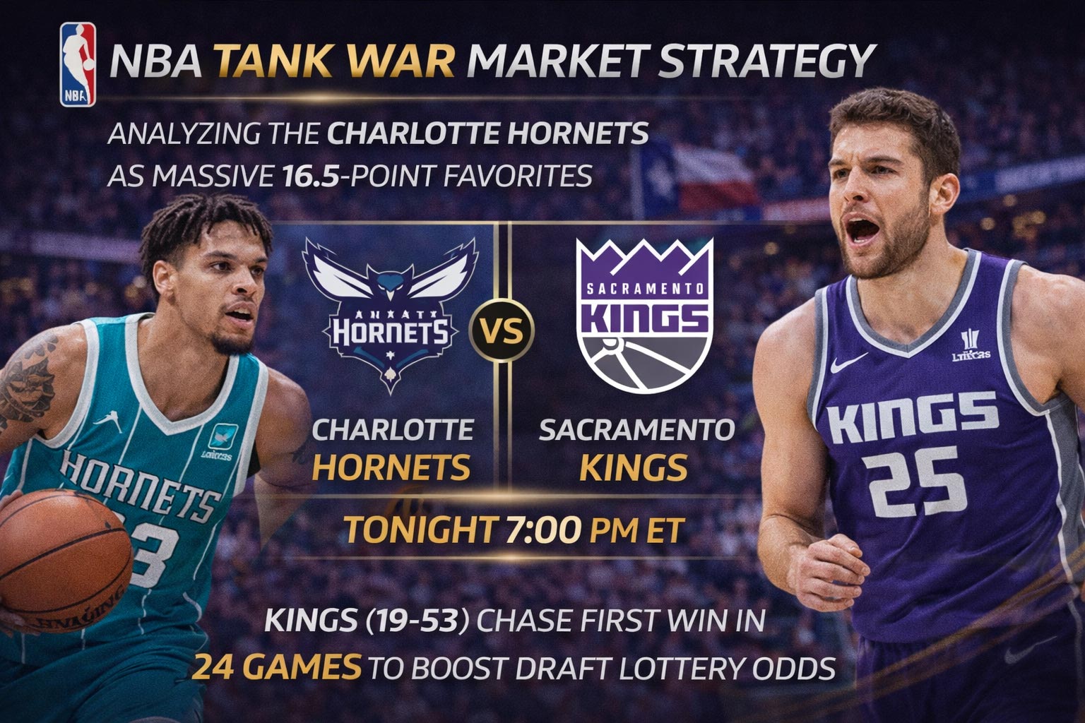 The Sacramento Kings are losing on purpose, and the market knows it. At 19-53 with nothing to play for except lottery positioning, they’re facing the Charlotte Hornets as 16.5-point underdogs tonight at 7:00 PM ET. This isn’t your typical garbage-time blowout situation—this is a strategic tank job meeting a spread that’s begging for contrarian action. In my analysis of the line movement, I’m seeing classic sharp money patterns that suggest the public is overvaluing Charlotte’s ability to cover. The expected value here isn’t in picking a winner; it’s in exploiting how badly Vegas thinks Sacramento wants to lose. Let’s break down why this bloated number might be the sharpest play of the night.