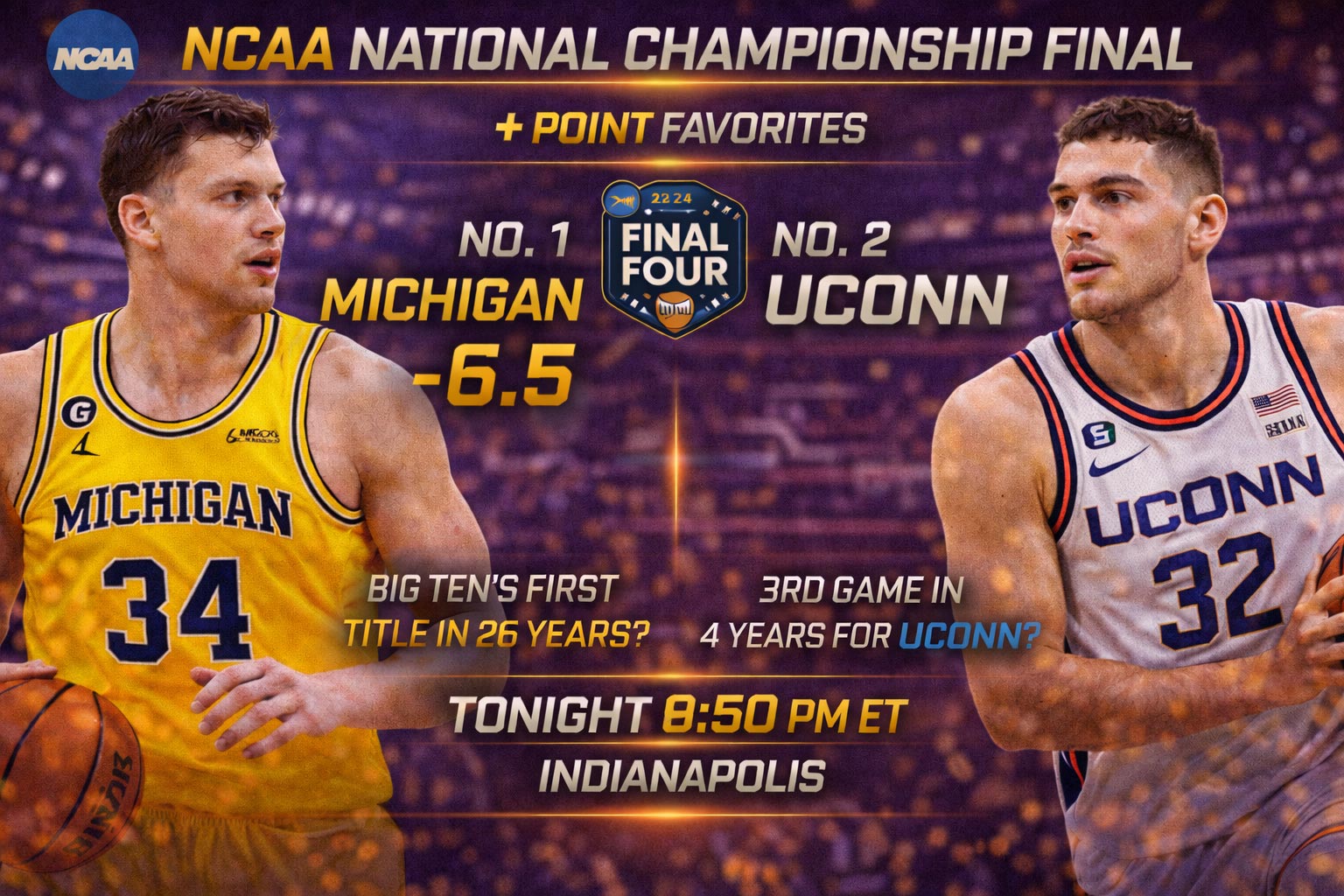 Tonight’s NCAA National Championship Final is basically a referendum on whether the Big Ten can finally show up when it matters. No. 1 Michigan opened as a 6.5-point favorite against No. 2 UConn at 9:20 PM ET in Indianapolis. The Wolverines are trying to end a 26-year title drought for the Big Ten. UConn’s hunting their third championship in four years. In my analysis of the line movement over the past 72 hours, something doesn’t add up. The public’s hammering Michigan, but the sharp money whispers a different story. Let me walk you through where the actual edge lives tonight.