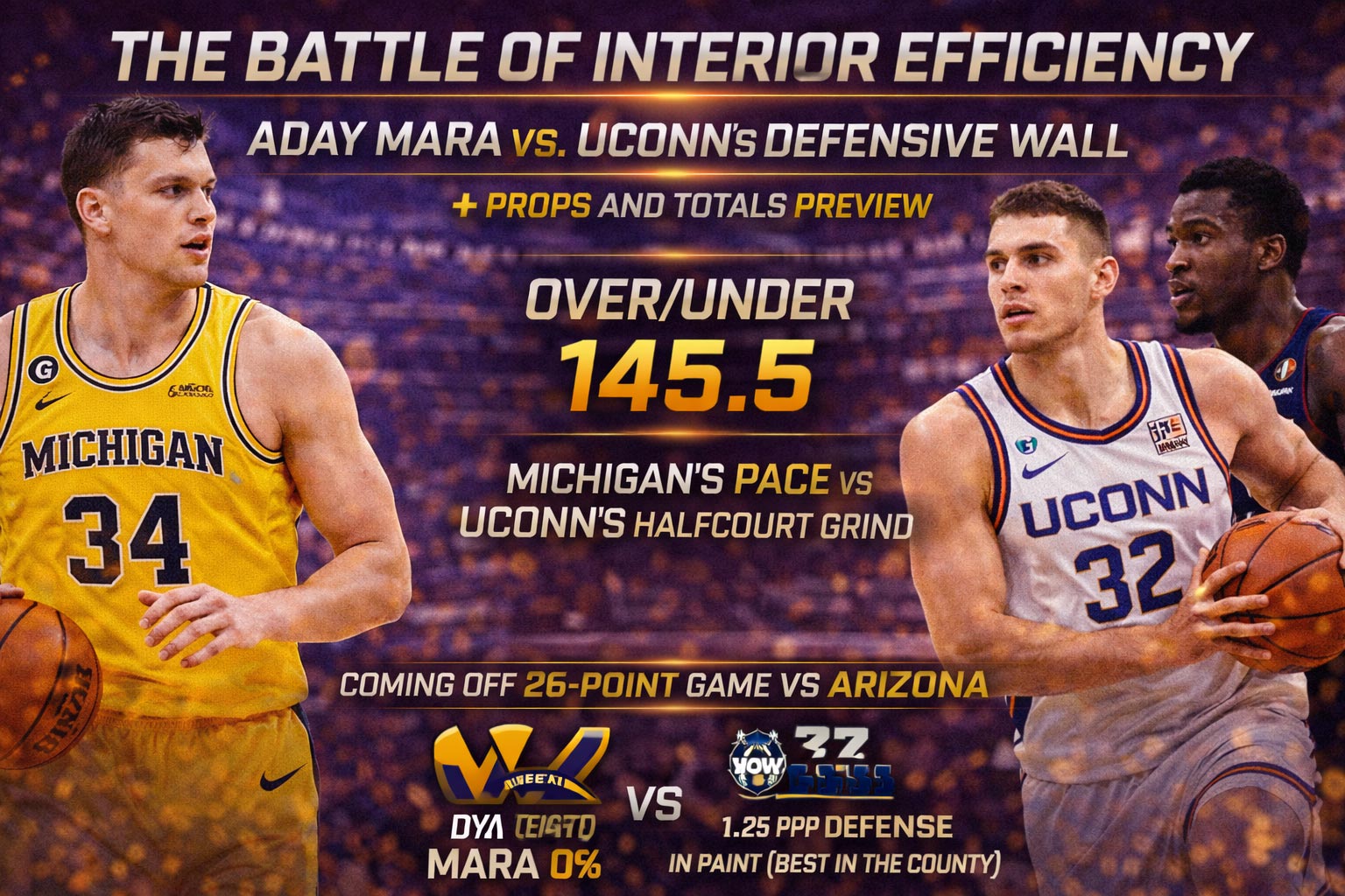 Here’s the contrarian angle: if Michigan over-relies on Mara, it actually slows their pace down. Post-ups take 14-18 seconds off the shot clock. Fewer possessions, lower total. The Wolverines’ best path to 75+ points involves perimeter shooting and transition buckets. But UConn’s perimeter defense ranks 8th in opponent three-point percentage at 29.7%. Every angle you examine points to the same conclusion.