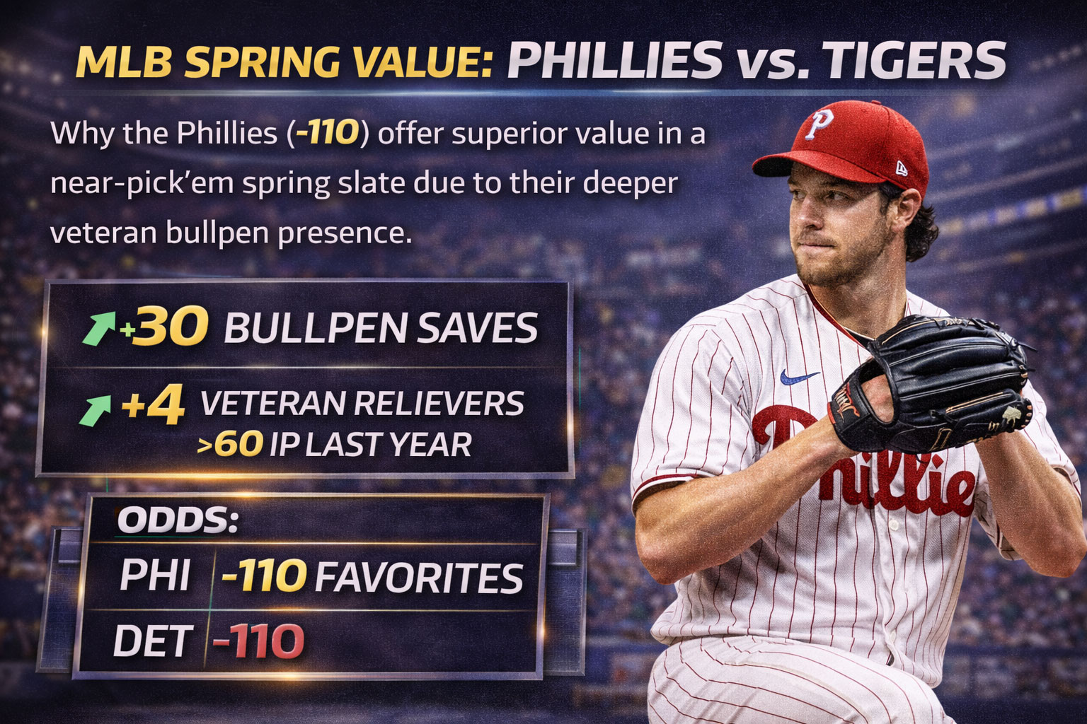 Spring training is where casual bettors go to lose money. They throw darts at lineups and ignore the one variable that actually matters in March baseball: bullpen depth. Today’s Phillies-Tigers matchup sits at -110 — essentially a pick’em. The market is asleep. Philly’s bullpen is playing a completely different sport than Detroit’s spring experiment.