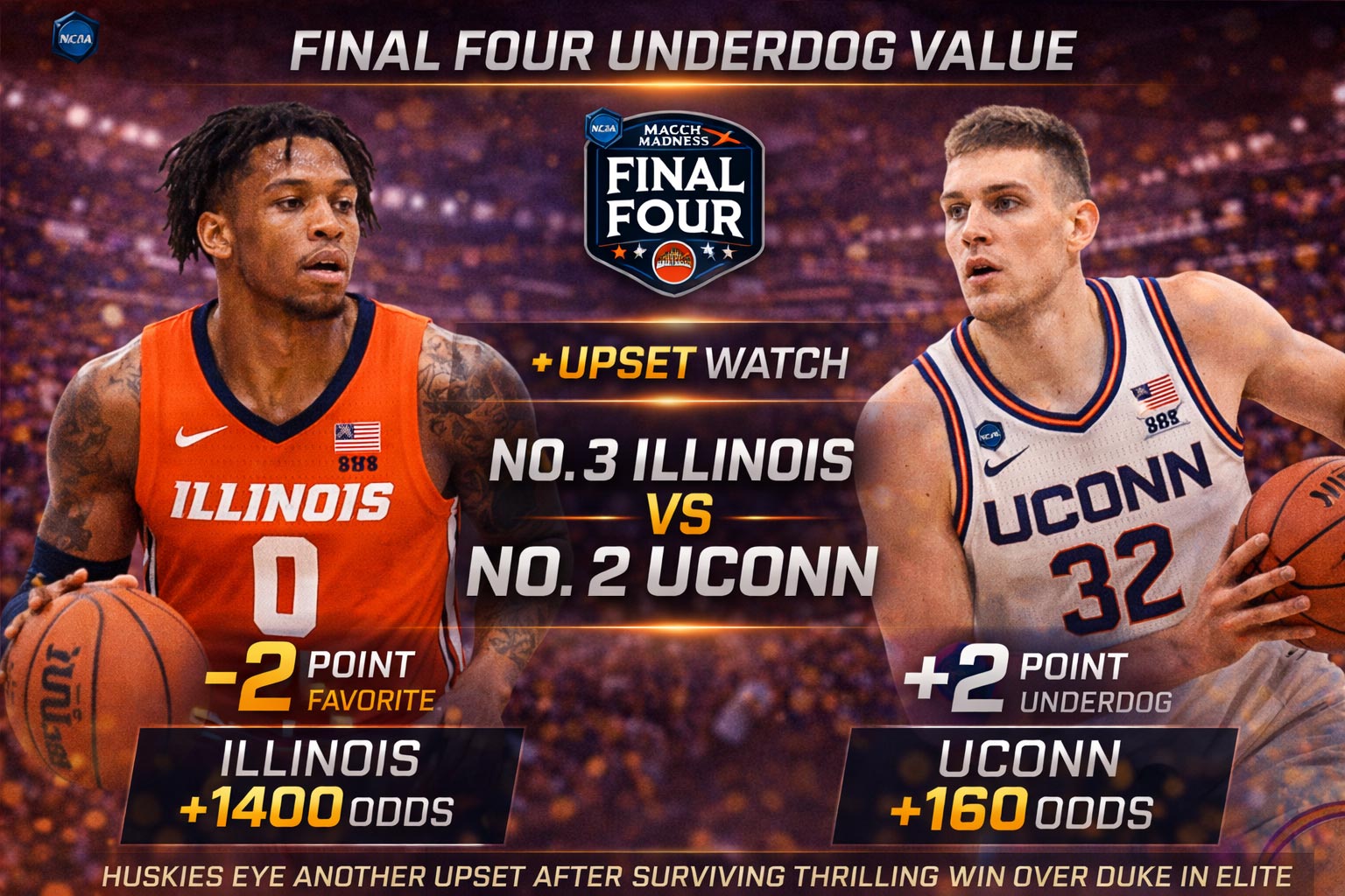 The market’s got this one backwards, and I’m about to show you why. No. 3 Illinois opened as a 2-point favorite against No. 2 UConn in Saturday’s Final Four semifinal, and the public’s eating it up. But after watching UConn dismantle Duke in the Elite Eight, I’m seeing a massive value gap that sharp bettors are already exploiting.